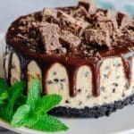 Why not impress your guests by serving this cheesecake in individual mini springform pans for personal portions? You could also create a layered dessert by crumbling this cheesecake into parfait glasses with alternating layers of crushed Oreos and whipped cream. For a fun twist, try chocolate-dipped Andes on the side or drizzle with mint-infused chocolate sauce to double down on the cool mint experience.