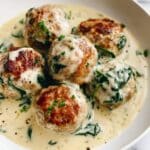 Delicious and tender baked chicken ricotta meatballs served with a rich and creamy spinach Alfredo sauce. This recipe combines lean ground chicken with creamy ricotta and Parmesan cheeses, baked to golden perfection, then topped with a smooth, cheesy sauce infused with fresh spinach. Perfect for a comforting family dinner that’s both flavorful and satisfying.