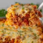 While this Beef Lombardi Casserole Recipe is centered around beef, you could substitute the ground beef with plant-based meat alternatives or sautéed mushrooms for a vegetarian version. Just adjust the seasoning to taste.
