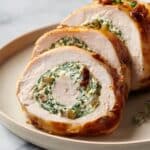 This Best Christmas Stuffed Turkey Breast recipe offers a flavorful and festive main course perfect for holiday celebrations. The tender turkey breast is pounded thin, filled with a delicious mixture of cream cheese, spinach, garlic, bacon, and fresh herbs, then rolled and baked to juicy perfection. A final broil ensures a golden, crispy exterior. Brushed with a buttery herb glaze, this elegant dish serves 4 and makes for an impressive yet easy holiday centerpiece.