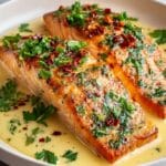 Sprinkle fresh chopped parsley over the salmon for a burst of color and fresh herbaceous notes. Serve immediately while the sauce is still warm and irresistible.