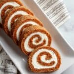 Keywords: carrot cake, carrot cake roll, cream cheese frosting, spiced cake, rolled cake, dessert recipe, holiday dessert, cream cheese roll