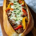 This Cheesesteak-Stuffed Garlic Bread is a delicious fusion of classic flavors wrapped in a crispy garlic-infused Italian loaf. Thinly sliced beef, sautéed bell peppers, and onions are combined and tucked inside hollowed-out bread, topped with melted provolone cheese for a hearty and flavorful meal or appetizer.