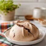 Whole large dome-shaped chocolate meringue cookie on a white plate, featuring its smooth light brown surface with natural cracks revealing dark chocolate underneath, placed prominently on a white marble countertop with natural lighting, styled with subtle shadows and simple background elements including a colorful plaid cloth and a small potted herb, professional food magazine style hero shot, photo taken with an iphone --ar 4:5 --v 7