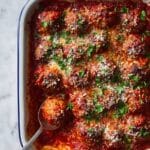 These Christmas Eve Meatballs are a festive and hearty Italian-American dish featuring a blend of ground pork and beef mixed with flavorful spices, ricotta cheese, and crispy bacon. Baked slowly in a rich crushed tomato sauce, they develop a tender texture and deep flavor perfect for holiday gatherings. Topped with Parmesan and fresh parsley, these meatballs bring warmth and tradition to your holiday table.