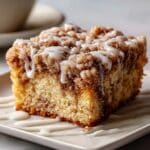 Single white square plate featuring one slice of cinnamon crumb cake with a thick crumbly topping and white glaze drizzled over, the slice angled to showcase the moist interior cake layers with visible cinnamon swirls and crumb texture, natural lighting highlighting the soft crumb and glaze sheen, placed on a white marble surface, intimate food blog style serving photo taken with an iphone --ar 4:5 --v 7