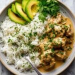 A vibrant and flavorful Coconut Lime Chicken and Rice dish featuring tender chicken breasts marinated in a tangy coconut lime sauce, pan-seared to golden perfection, and served over fragrant coconut-infused basmati rice with fresh cilantro and lime zest for a refreshing finish.