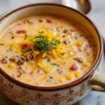 This Creamy Cowboy Soup is a hearty and comforting dish perfect for chilly days. Packed with ground beef, tender potatoes, pinto beans, corn, and diced tomatoes with green chilies, it combines smoky spices and creamy heavy cream to create a rich, flavorful soup that’s both satisfying and easy to prepare.