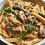 A comforting and delicious creamy mushroom and asparagus chicken penne pasta dish, perfect for a quick weeknight dinner. Tender chicken pieces are sautéed with mushrooms and fresh asparagus, then simmered in a rich Parmesan cream sauce and tossed with al dente penne pasta.