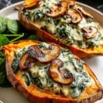 Delight in these creamy mushroom and spinach stuffed sweet potatoes, a flavorful and hearty vegetarian dish perfect for a nutritious meal. Baked to tender perfection, the sweet potatoes are filled with a savory mixture of sautéed mushrooms, wilted spinach, creamy cheese, and garlic, then topped with melted cheese for a comforting and satisfying experience.