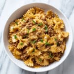 This Creamy Parmesan Garlic Beef Bowtie Pasta is a hearty and flavorful dish combining savory ground beef with a rich, creamy Parmesan sauce. Infused with garlic, Italian seasoning, and a hint of smoked paprika, the pasta is perfectly coated in a velvety sauce made from beef broth, butter, and half and half. Ready in just 35 minutes, this comforting bowlful is ideal for a satisfying weeknight dinner that will delight the whole family.