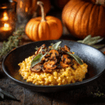 This rich and velvety pumpkin risotto is the perfect autumn comfort dish — featuring arborio rice slowly cooked in vegetable broth and folded with creamy pumpkin purée, Parmesan, and warming spices. Topped with golden sautéed mushrooms and fresh herbs, it’s an elegant vegetarian main or side.