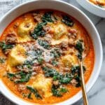 Keywords: creamy ravioli soup, Italian soup recipe, ravioli soup with sausage, easy soup recipes, creamy tomato soup with pasta