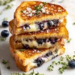This Crispy Blueberry Grilled Cheese combines the sweetness of a homemade blueberry lemon thyme jam with the rich flavors of white cheddar and mozzarella cheeses, all sandwiched between perfectly toasted sourdough bread. The result is a beautiful balance of sweet, tangy, and savory flavors with a delightfully crispy texture, perfect for a unique and satisfying meal.