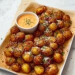 - Serve: Arrange the crispy potato balls on a serving platter. Garnish with extra chopped parsley and freshly grated Parmesan cheese, if desired. Serve immediately alongside the Sriracha mayo dipping sauce for a flavorful appetizer or snack.