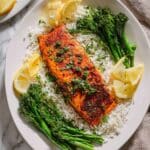 Large white oval platter featuring a whole roasted salmon fillet with crispy, golden-brown skin, garnished with finely chopped fresh herbs, surrounded by vibrant steamed broccolini arranged neatly on either side. The salmon is accompanied by a generous portion of fluffy white rice spread along the platter, and several lemon wedges elegantly placed for garnish. The entire dish is presented on a white marble countertop with natural lighting, captured in a professional 3/4 angle shot emphasizing texture and freshness, like a hero shot from a food magazine, photo taken with an iphone --ar 4:5 --v 7