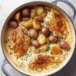 This easy Chicken and Potatoes with Dijon Cream Sauce recipe features juicy boneless skinless chicken breasts and tender baby potatoes cooked in a creamy, flavorful Dijon mustard sauce. It’s a comforting, hearty meal that comes together quickly in just 30 minutes, combining stovetop searing with oven baking for perfectly cooked chicken and potatoes with a rich sauce.