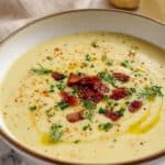 This Easy Roasted Garlic Soup is a creamy, comforting dish featuring roasted potatoes, shallots, and abundant garlic heads. Infused with aromatic thyme and rosemary, blended until smooth, then enriched with heavy cream and finished with savory toppings, it makes a perfect starter or light meal served with fresh baguette.