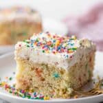 Single white plate with a single square slice of funfetti cake topped with a thick layer of creamy frosting speckled with colorful sprinkles, revealing the moist and airy interior dotted with vibrant confetti-like bits, photographed close-up at an angled view that emphasizes the soft crumb texture and detailed frosting, garnished lightly with extra rainbow sprinkles, all set on a white marble surface with natural lighting, styled like a food blog serving, photo taken with an iphone --ar 4:5 --v 7