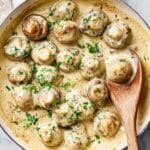Garlic Parmesan Mushrooms are a rich and creamy side dish featuring tender whole white mushrooms cooked in a buttery garlic sauce, enriched with cream cheese, Parmesan, and heavy cream, and seasoned with Italian herbs for a flavorful finish.