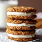 These Gingerbread Oatmeal Cream Pies combine soft, spiced gingerbread oatmeal cookies sandwiched with a rich and creamy cream cheese frosting. Perfect for holiday gatherings or anytime you crave a cozy, flavorful treat with a delightful balance of spices, molasses, and creamy sweetness.