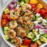 A fresh and vibrant Greek Shrimp Salad featuring succulent sautéed shrimp, crisp cucumbers, juicy cherry tomatoes, creamy avocado, and tangy feta cheese, all tossed in a zesty lemon-herb dressing. Perfect for a light lunch or a quick dinner, this salad combines Mediterranean flavors with a healthy, protein-packed twist.