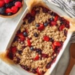 Reserve about ½ to ¾ cup of the oat mixture for the topping. Press the remaining mixture firmly into the bottom of your prepared baking dish to form an even base layer. Spread the thickened berry filling evenly over the crust, then sprinkle the reserved oat mixture on top, either as larger clumps or smaller crumbs, whichever you prefer.