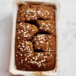 Full rectangular white baking dish with a freshly baked dense oatmeal loaf, the top evenly sprinkled with rolled oats, showcasing a warm golden-brown crust that looks moist and slightly cracked, placed on a white marble countertop, photographed with natural light from a 3/4 angle capturing the entire uncut loaf, professional food styling photo taken with an iphone --ar 4:5 --v 7