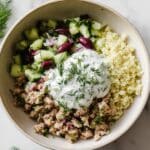 Keywords: Greek chicken bowl, ground chicken recipe, healthy Greek bowls, coconut yogurt tzatziki, Mediterranean diet, low carb, quick dinner, cauliflower rice bowl