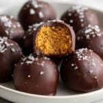 There’s no real need to reheat these truffles since they’re best enjoyed chilled for that crisp chocolate shell and soft, spiced interior. However, if you prefer, allow them to sit at room temperature for about 15 minutes before serving to soften slightly and reveal more of their creamy pumpkin filling.