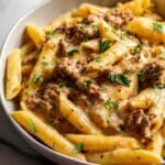 This High Protein Creamy Beef Pasta is a perfect quick weeknight dinner, combining lean ground beef with a rich, creamy tomato sauce made with Greek yogurt and parmesan. Ready in just 30 minutes, this hearty and flavorful dish features tender penne pasta tossed in a savory sauce, garnished with fresh herbs for a satisfying meal.
