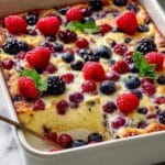 Large white rectangular baking dish filled with a vibrant mixed berry casserole, showcasing a fluffy, golden-brown baked custard base studded generously with whole blueberries, raspberries, and blackberries. The top is lightly browned and scattered with fresh berries and green herb leaves for garnish, photographed from a 3/4 angle on a white marble countertop with natural lighting, professional food magazine hero shot photo taken with an iphone --ar 4:5 --v 7