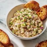 A high-protein, flavorful tuna chickpea salad combining flaky albacore tuna with creamy mashed chickpeas and a zesty dressing. Perfect for a quick, nutritious lunch or light dinner, this salad is boosted with crunchy celery, sharp shallots, and optional fresh dill for a refreshing finish.