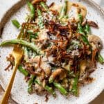 Keywords: green bean casserole, homemade green bean casserole, fried shallots, casserole side dish, holiday side, creamy green beans, mushroom sauce