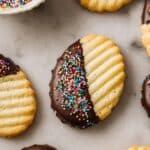 - Dip and Decorate: Dip each cooled cookie halfway into the melted chocolate mixture, allowing excess to drip off. Place them onto a parchment-lined baking sheet and immediately sprinkle with decorative sprinkles.