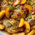Juicy boneless chicken thighs cooked in a flavorful skillet with a sweet and spicy jalapeño peach glaze. This quick and easy recipe combines fresh peaches, jalapeños, and a tangy peach preserves glaze to create a perfect balance of heat and sweetness, making it a delightful main dish for any dinner.