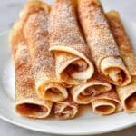 Large white plate filled with an abundant stack of Mexican cinnamon sugar rolled crepes, perfectly golden with a dusting of cinnamon and sugar evenly coating each crepe, arranged to showcase their tubular shape and soft texture, presented as a whole batch on a pristine white marble countertop, natural lighting emphasizing the warm tones and fine sugar crystals, professional food magazine style hero shot taken with an iphone --ar 4:5 --v 7
