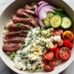 Keywords: Mediterranean steak bowl, sirloin steak recipe, tzatziki sauce, healthy steak bowl, grilled steak, quick Mediterranean dinner