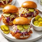 - Assemble the Sandwiches: Spread about 1 tablespoon of mayonnaise on the bottom half of each toasted bun. Place one hot, sauced chicken cutlet on top, then layer with coleslaw and pickles. Cover with the top bun and serve immediately for best texture and flavor.