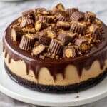 This cheesecake freezes beautifully. Wrap it tightly with plastic wrap and then aluminum foil, ensuring it’s sealed well to avoid freezer burn. Thaw overnight in the fridge before serving. Ganache topping can sometimes change texture after freezing, so add fresh mini Reese’s on top after thawing if desired.