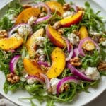 A refreshing and vibrant Peach Arugula Salad featuring ripe peaches, peppery arugula, creamy goat cheese, and crunchy toasted nuts, all brought together with a tangy balsamic honey dressing. Perfect for a light lunch or a delightful side dish.