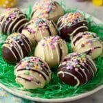 White round platter filled with a complete assortment of whole chocolate-covered cake balls, some coated in white chocolate, others in dark chocolate, each decorated with drizzled contrasting chocolate and topped with colorful pastel sprinkles and confetti-style candy pieces, arranged on a bed of green edible decorative grass, shot from a 3/4 angle on white marble background with natural lighting, styled like a professional food magazine hero shot, photo taken with an iphone --ar 4:5 --v 7