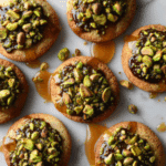 - While cookies cool, prepare the topping: In a saucepan over medium heat, melt butter, honey (or maple syrup), brown sugar, and salt. Bring to a gentle simmer, then stir in pistachios. Cook for 2–3 minutes until glossy and thickened.