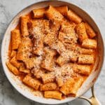 Bring a large pot of salted water to a boil. Add your rigatoni or penne and cook according to the package instructions until perfectly al dente. Before draining, scoop out 60ml of the starchy pasta water and set it aside. Drain the pasta in a colander and keep it warm.