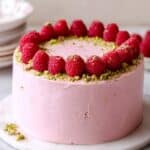 Keywords: Raspberry Pistachio Cake, layered cake, raspberry jam, raspberry buttercream, pistachio flour cake, homemade cake, dessert recipe