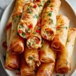 Large white serving platter filled with an abundant stack of golden, crispy spring rolls tightly packed with a creamy mixture of diced vegetables including red bell peppers and green herbs, garnished lightly with scattered fresh chopped herbs and red pepper flakes, shot from a professional 3/4 angle showcasing the entire dish on a white marble countertop with natural lighting, food magazine hero styling photo taken with an iphone --ar 4:5 --v 7