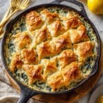 This recipe succeeds wonderfully because it balances comforting creaminess with fresh, bright flavors. The key lies in using a quick homemade sauce thickened with butter, flour, and milk for that perfectly smooth texture before folding in spinach artichoke dip to boost flavor depth. Fresh dill and lemon zest add vibrant notes that beautifully complement the salmon’s natural richness. Baking in an oven-safe skillet ensures even cooking and the buttery puff pastry topping crisps to golden perfection, sealing in all that moisture and flavor.