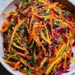 This vibrant Shaved Rainbow Carrot Sesame Salad features julienned carrots tossed with fresh herbs and a flavorful sesame-based dressing. Toasted sesame seeds add a nutty crunch, while the dressing combines sesame oil, rice vinegar, miso, and a hint of sriracha for a perfect balance of tangy, sweet, and spicy notes. It’s a refreshing, healthy side dish that is quick to prepare and deliciously satisfying.