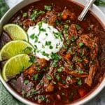 This rich and flavorful Birria recipe uses a slow cooker to tenderize beef chuck roast in a deeply spiced chili and tomato sauce. Aromatic dried chilies, roasted vegetables, and warming spices create an authentic Mexican stew perfect for serving with consommé, garnished with fresh onion, cilantro, and lime wedges.