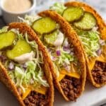 Remove your crispy, cheesy smash burger tacos from the skillet and transfer them to plates. Top each with shredded iceberg lettuce, diced onion, and dill pickle chips for crunch and tang. Drizzle with creamy burger sauce if you like, then serve immediately while still warm and melty.